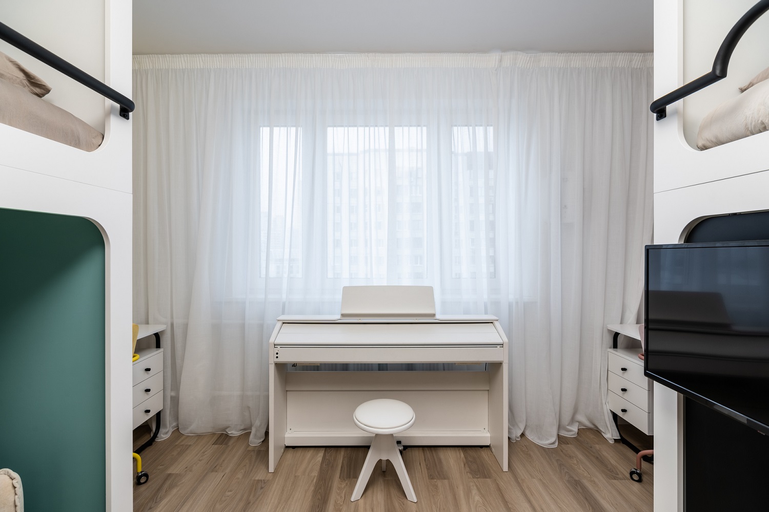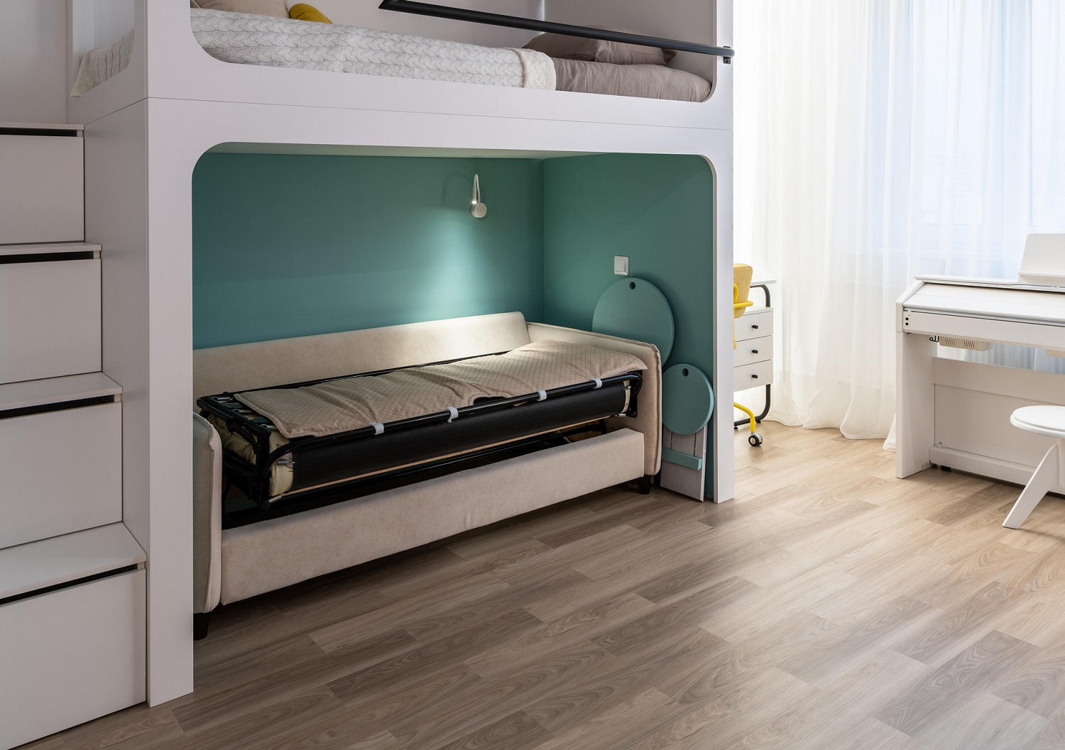 На полу — кварцевый ламинат Fargo Classic Дуб Бангкок 64W965: за такой пол не страшно даже в детской.