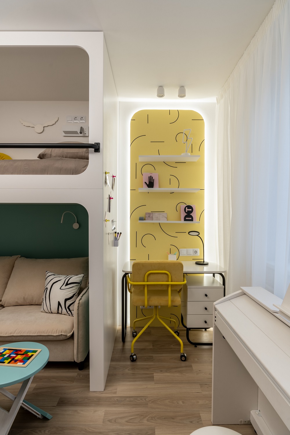 В детской применили интерьерную магию: разделили пространство на спальню, рабочую зону и гардеробную. Кстати, чулан, в котором жил Гарри Поттер, и знаменитые очки здесь тоже появились.